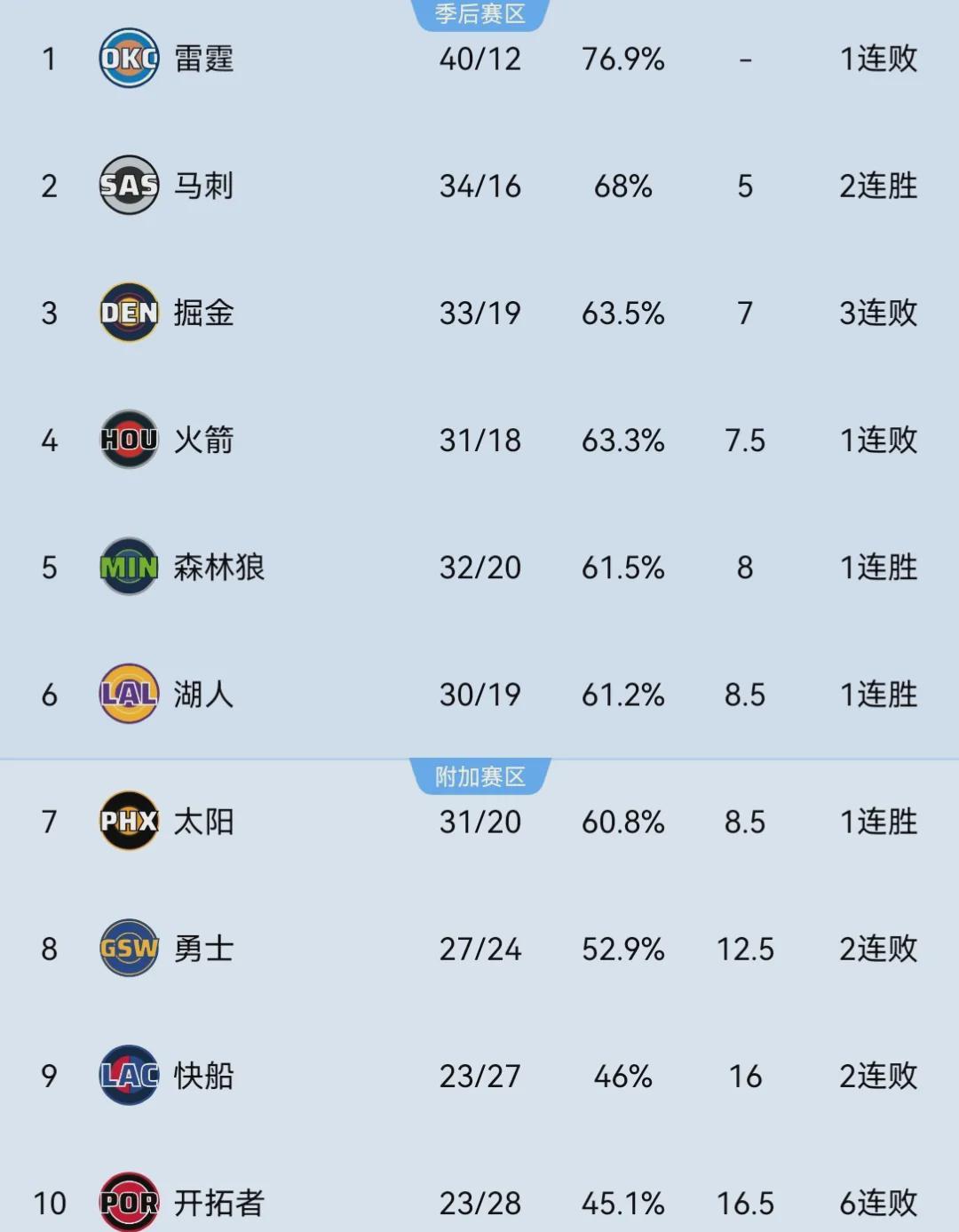 目前为止,火箭以31胜18负排名西部第四,落后第三的掘金0.5个胜场,领先第七的太阳1个胜场,距离前三甲和掉出季后赛区域都是一步之遥的事。